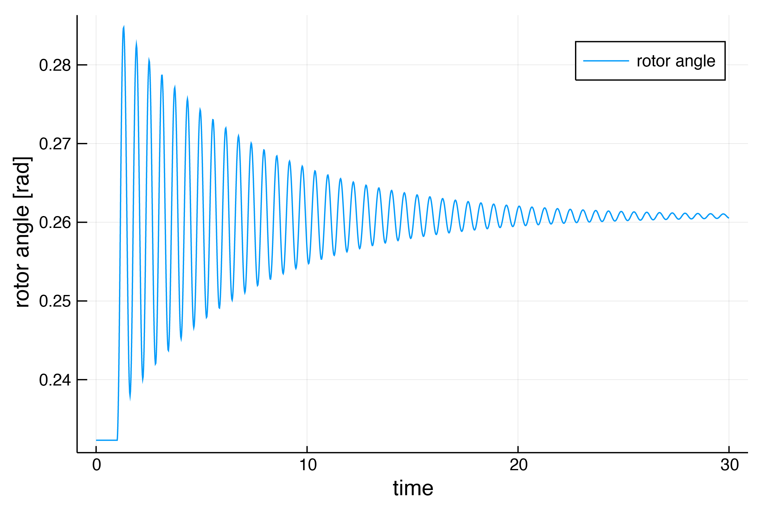 plot(angle, xlabel="time", ylabel="rotor angle [rad]", label="rotor angle")