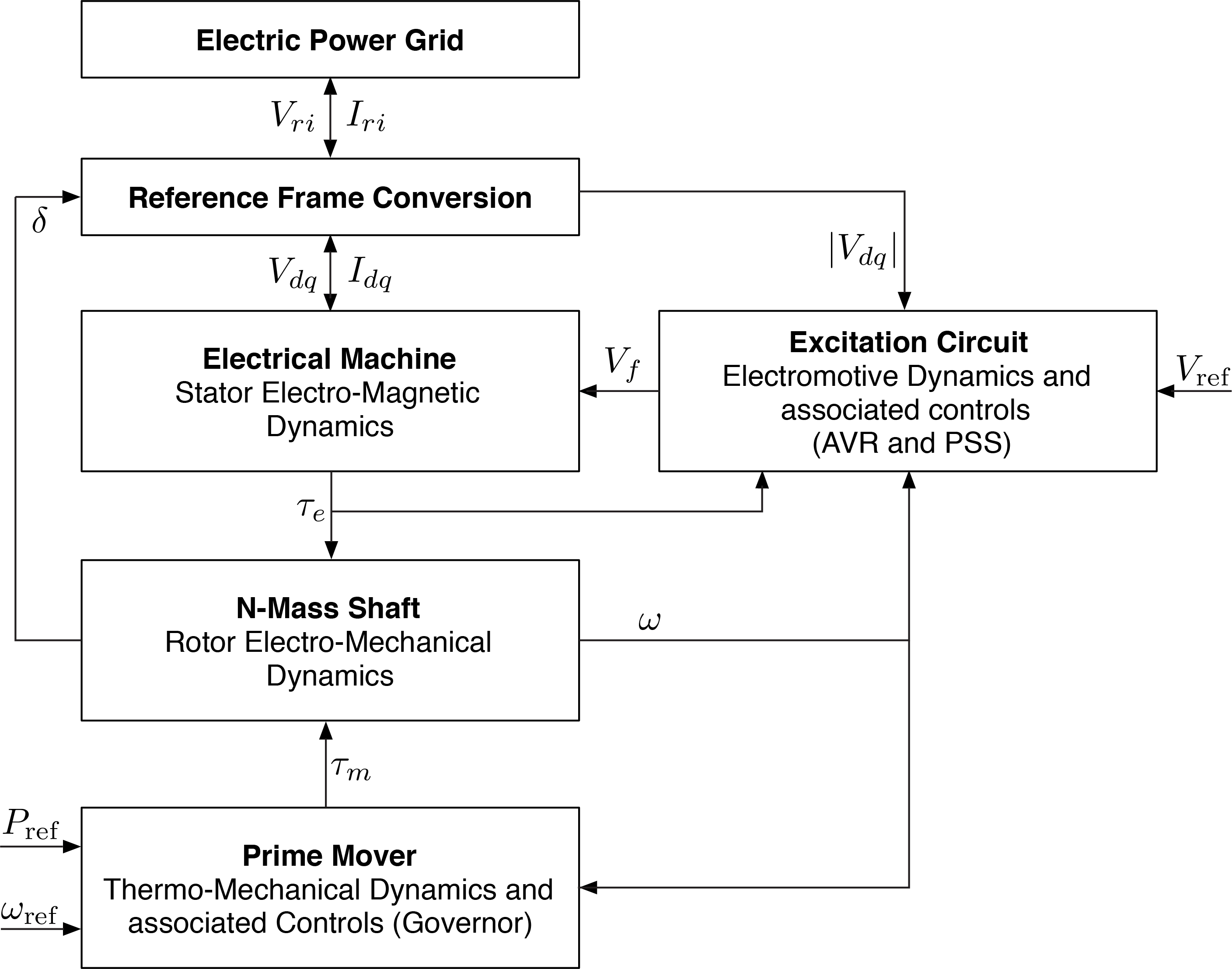 - Prime Mover and Turbine Governor: Thermo-mechanical dynamics and associated controllers.